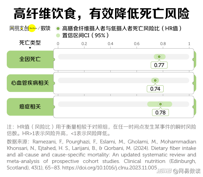 2024 年,一項(xiàng)覆蓋全球 450 萬(wàn)人的前瞻性薈萃研究也印證了這一點(diǎn)。與膳食纖維攝入最低組相比,攝入量最高組的全因死亡風(fēng)險(xiǎn)下降 23%,心血管病死亡風(fēng)險(xiǎn)下降 26%,癌癥相關(guān)死亡風(fēng)險(xiǎn)下降 22% [9]。