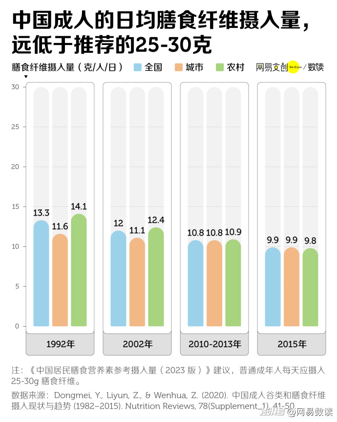 1992 年,全國(guó) 20 歲及以上成年人每天還能攝入 13.3 克膳食纖維;到了 2015 年,已降至 9.9 克,連推薦量的一半都不到。