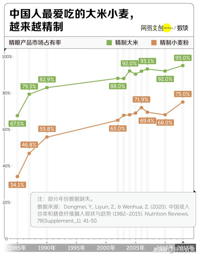 過(guò)去三十年,中國(guó)人的飯碗里不僅谷物變少了,還被精米白面一統(tǒng)江湖,導(dǎo)致主食的纖維密度進(jìn)一步被削弱。