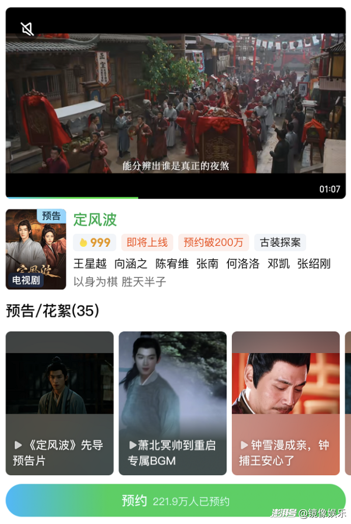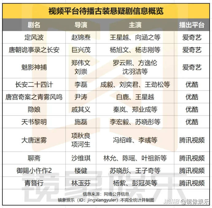 而在各大平臺的待播內容中,古裝懸疑劇也是各家儲備的熱門題材。據鏡象娛樂不完全統計,截至目前,僅優(yōu)愛騰三家待播的古裝選懸疑劇就有十多部。其中,除了已經定檔的《定風波》之外,優(yōu)酷的《唐宮奇案之青霧風鳴》也已進入密集宣發(fā)期,站內預約破百萬,騰訊視頻的《御賜小仵作》第二季,也于7月29日拿到發(fā)行許可,預計不久將與觀眾見面。