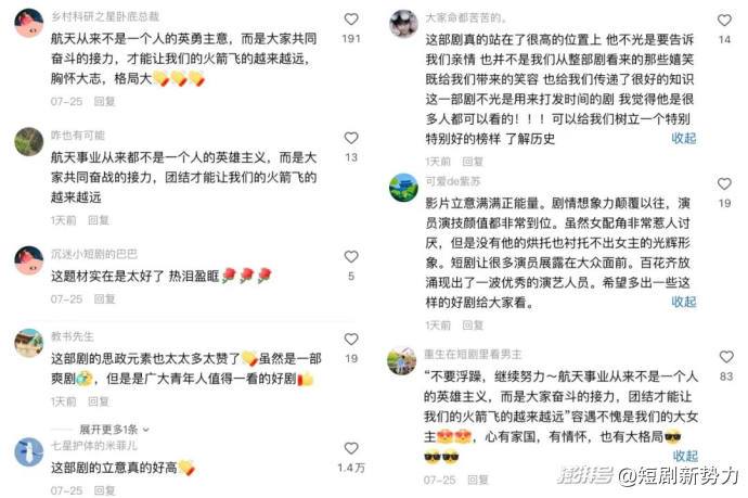 這種敘事設(shè)計,讓穿越從 “工具”變成了 “紐帶”。它連接了過去與現(xiàn)在,讓 1955 年的理想主義者親眼看見祖國的繁榮;也連接了個人與時代,讓容遇的人生遺憾在為國奉獻中得到彌補。觀眾在 “太奶奶管教重孫” 的輕松日常里,不知不覺被這份責(zé)任與傳承打動,正如評論區(qū)高頻出現(xiàn)的 “家國共情” 一詞,證明正能量敘事從不是 “說教”,只要與觀眾的價值情感共振,就能爆發(fā)出強大的感染力。
