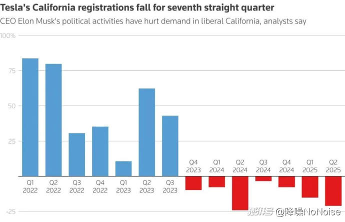 ▲特斯拉在加州的注冊量連續(xù)第七個(gè)季度下滑