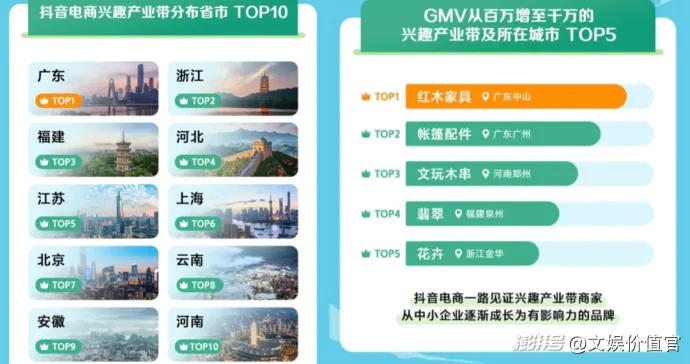 最新發(fā)布《2025抖音電商興趣產(chǎn)業(yè)帶數(shù)據(jù)報(bào)告》,公布了抖音電商興趣產(chǎn)業(yè)帶分布省市Top 10,廣東拔得頭籌,緊隨其后的浙江、福建、河北等也都在蓄勢發(fā)力。在這份報(bào)告中,廣東中山的紅木家具、廣東廣州的帳篷配件、河南鄭州的文玩木串、福建泉州的翡翠、浙江金華的花卉等興趣產(chǎn)業(yè)帶,在抖音電商都實(shí)現(xiàn)了GMV從百萬到千萬量級的突破,背后是無數(shù)個(gè)以店播開拓增長新路徑的中小商家。