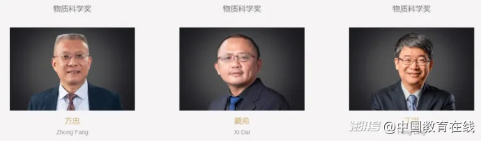薛其坤、潘建偉、馬大為、馮小明、周其林、王貽芳、陸錦標(Kam-Biu Luk)、盧柯(未領獎)、張杰、楊學明、趙忠賢、陳仙輝、張濤、李亞棟