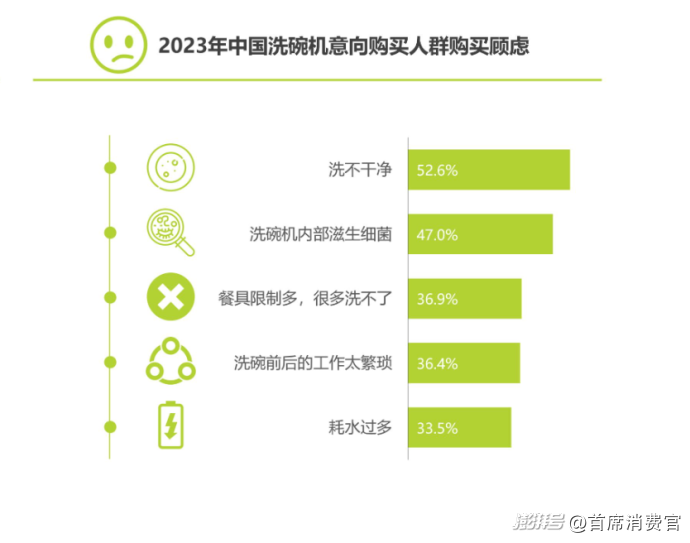 艾瑞咨詢2023年的調(diào)查戳中了用戶的痛點(diǎn):超過(guò)半數(shù)(52.6%)有意購(gòu)買洗碗機(jī)的人,最擔(dān)心的就是洗不干凈。一些消費(fèi)者反映,洗碗之前得先沖掉餐具里的食物殘?jiān)蝗痪偷戎仡^去排水口摳殘?jiān)?;凝結(jié)住的油醬、干掉的飯粒得提前刮掉,想洗干凈全靠運(yùn)氣;蒸雞蛋羹的碗更是洗碗機(jī)的 “一生之?dāng)场?,熱水能去油,但?duì)上蛋白質(zhì)就是徹底 “踢到了鐵板”,硬化后就死死粘在了碗上。在他們看來(lái),洗碗機(jī)不僅不能完全解放雙手,甚至還增加了一些額外的工作,這使得很多人對(duì)購(gòu)買洗碗機(jī)持謹(jǐn)慎態(tài)度。