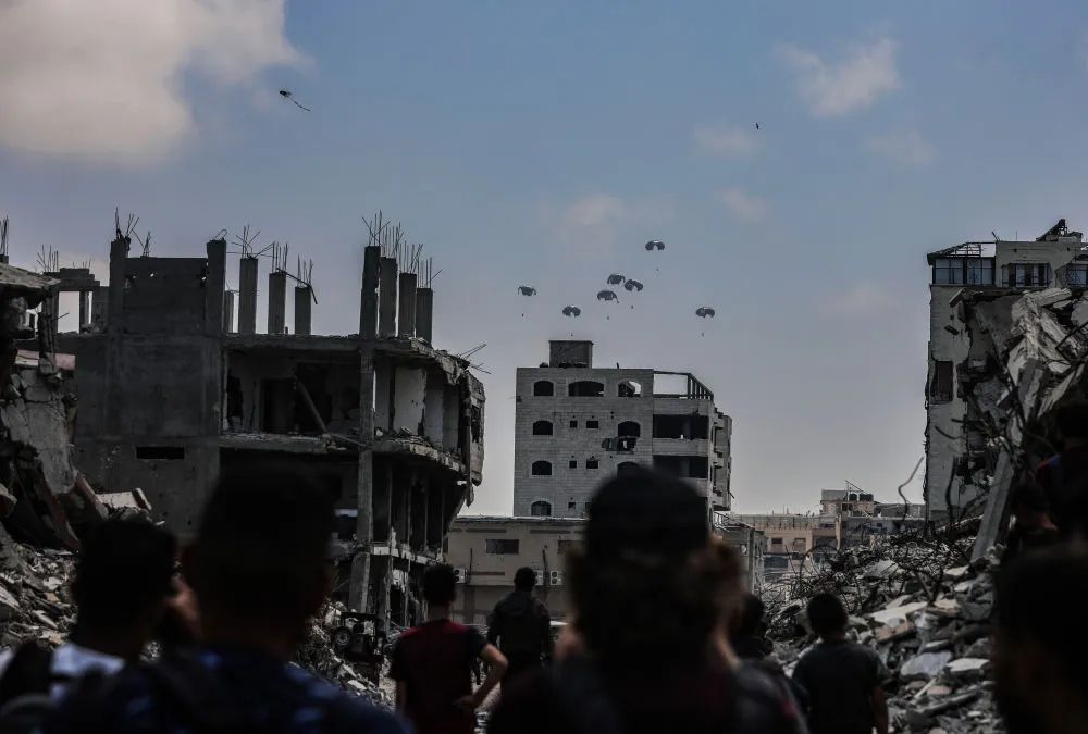 8月8日,飛機在加沙城上空空投物資。