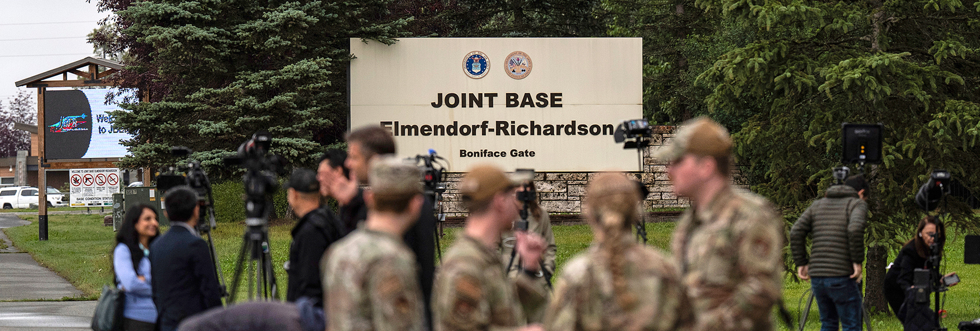 8月14日,媒體記者等人員在埃爾門多夫-理查森聯(lián)合軍事基地大門前等待。