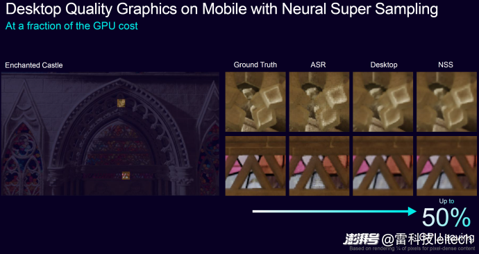 在Arm的“魔法城堡”演示中,Arm NSS能在 4 毫秒內(nèi)將540p優(yōu)化升級至1080p,畫質(zhì)幾乎與原生渲染無異。從分辨率渲染中釋放出來的性能,可以被用來強(qiáng)化特效渲染和提升幀率,也能根據(jù)需要進(jìn)一步降低平均功耗,讓移動端設(shè)備擁有更長的游戲續(xù)航。