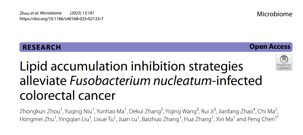 近日,蘭州大學藥學院微生物組智能診療科研團隊在國際知名期刊《Microbiome》在線發(fā)表了題為“Lipid accumulation inhibition strategies alleviate Fusobacterium nucleatum-infected colorectal cancer”的最新研究成果,通過脂質(zhì)抑制策略緩解了具核梭桿菌感染的結(jié)直腸癌。蘭州大學為該論文第一署名單位,博士生周忠坤為第一作者,蘭州大學陳朋教授為通訊作者。該工作得到了甘肅省科技重大專項、蘭州市科技項目以及蘭州大學大學生創(chuàng)新創(chuàng)業(yè)等項目的共同資助。