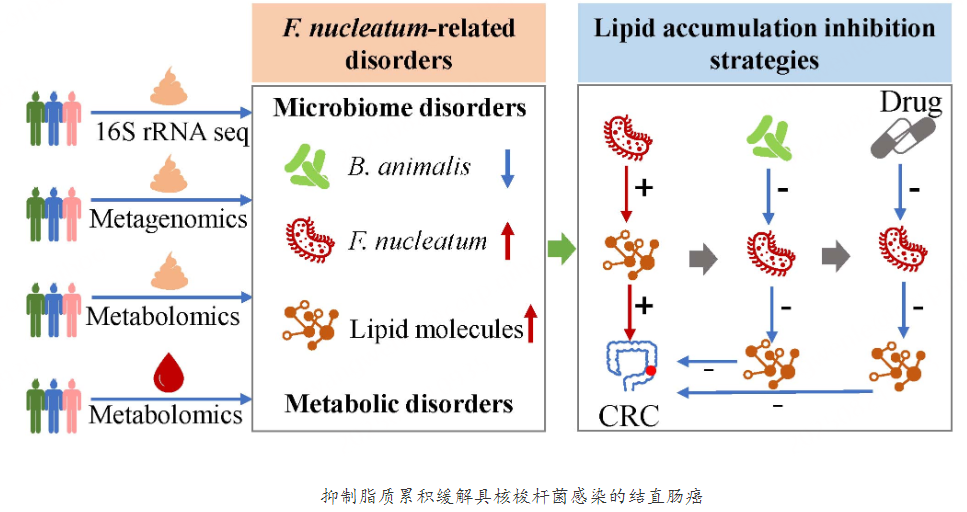具核梭桿菌(Fusobacterium nucleanum,F(xiàn). nucleanuum)在結(jié)直腸癌(CRC)中普遍存在,它可以通過多種途徑促進CRC增殖和誘導化療耐藥。開發(fā)治療具核梭桿菌感染的CRC的策略具有重要意義。該研究通過對人類糞便進行Shotgun宏基因組學和代謝組學分析,以及對人類血液進行代謝組學分析,揭示了結(jié)直腸癌的微生物組失調(diào)和代謝失調(diào)。此外,研究團隊通過體內(nèi)外實驗系統(tǒng)地評估了動物雙歧桿菌對具核梭桿菌和CRC的抑制作用。通過在大腸桿菌的異源表達驗證了動物雙歧桿菌膽酸鹽水解酶(BSH)的功能。最后,團隊進行了膽汁酸和臨床藥物庫的篩選實驗。研究結(jié)果表明CRC患者糞便中具核梭桿菌豐度增加,脂質(zhì)代謝產(chǎn)物富集,雙歧桿菌耗竭。此外,動物雙歧桿菌能夠以酸依賴的方式抑制具核梭桿菌和CRC細胞的生長,并減少具核梭桿菌誘導的小鼠腫瘤增加。從機制上講具核梭桿菌感染后導致脂質(zhì)累積,加劇了CRC小鼠腸道炎癥和腸屏障破壞,而動物雙歧桿菌緩解了這些變化,增加了微生物多樣性指數(shù),減少了脂質(zhì)代謝產(chǎn)物,改變了小鼠的次級膽汁酸組成。特別是E. coli-BSH和熊去氧膽酸(UDCA)能夠抑制具核梭桿菌誘導的脂質(zhì)積累和FASN/CPT1/NF-κB通路的上調(diào)。此外,它們還緩解了具核梭桿菌相關(guān)的體內(nèi)腸道腫瘤發(fā)生。與單獨使用5-FU相比,以具核梭桿菌感染的CRC細胞和小鼠皮下腫瘤為模型,五氟利多、奧利司他(FASN抑制劑)和5-FU的組合顯示出更優(yōu)的抑制作用。該研究為靶向具核梭桿菌感染的CRC患者的精準治療提供了理論依據(jù)。