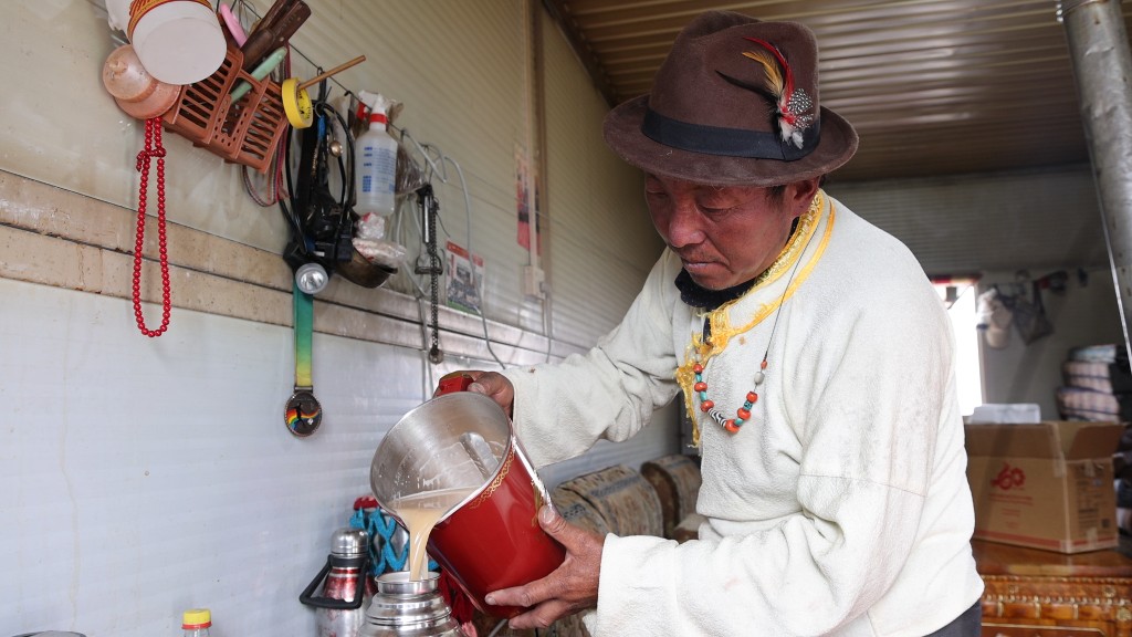 圖為日喀則市定結(jié)縣郭加鄉(xiāng)切村村民拉巴用中央代表團(tuán)送來的酥油茶壺打酥油茶。