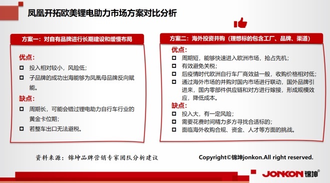 通過(guò)對(duì)上述上海鳳凰開(kāi)拓海外市場(chǎng)的兩個(gè)方案進(jìn)行對(duì)比,我們發(fā)現(xiàn)各有利弊,但是從時(shí)間成本考慮,海外投資并購(gòu)尋找包含工廠、品牌和渠道的理想標(biāo)的的優(yōu)點(diǎn)非常突出,有利于鳳凰抓住歐美鋰電市場(chǎng)的黃金時(shí)期進(jìn)行快速發(fā)展。錦坤品牌營(yíng)銷(xiāo)專家團(tuán)建議可以在不放棄對(duì)自有品牌進(jìn)行長(zhǎng)期經(jīng)營(yíng)的基礎(chǔ)上積極尋求海外投資并購(gòu)的機(jī)會(huì)。