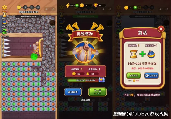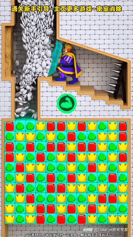 在消除過(guò)程中是需要一定策略的,在石頭滾下來(lái)的那個(gè)口,要優(yōu)先消除掉,不然后續(xù)影響石頭往下落。這也就意味著,一步消錯(cuò),基本就是要重來(lái)的。其設(shè)計(jì)呼應(yīng)了消除類(lèi)游戲 “玩法創(chuàng)新求變” 的行業(yè)趨勢(shì),打破品類(lèi)固化格局。
