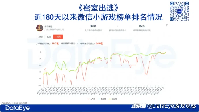 近期,DataEye研究院發(fā)現(xiàn),一款上線(xiàn)已久的三消小游戲《密室出逃》登頂微信小游戲人氣榜。