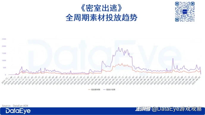 DataEye-ADX投放數(shù)據(jù)顯示,《密室出逃》小游戲端在去年12月開(kāi)始進(jìn)行效果廣告投放,截止至9月2日,該游戲共投放5305組素材(圖片+視頻),在今年五月經(jīng)歷一波投放高峰,日均在500組左右,其余時(shí)間維系在日均百組素材投放量的量級(jí)。投放節(jié)奏與小游戲 “短期沖量→中期留存→長(zhǎng)期變現(xiàn)” 的生命周期高度匹配。視頻和圖片占比五五開(kāi)。