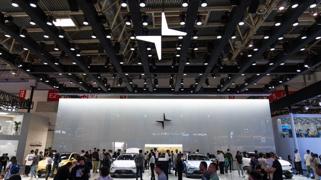 吉利公司旗下的極星汽車標(biāo)志LOGO和展臺。視覺中國 圖