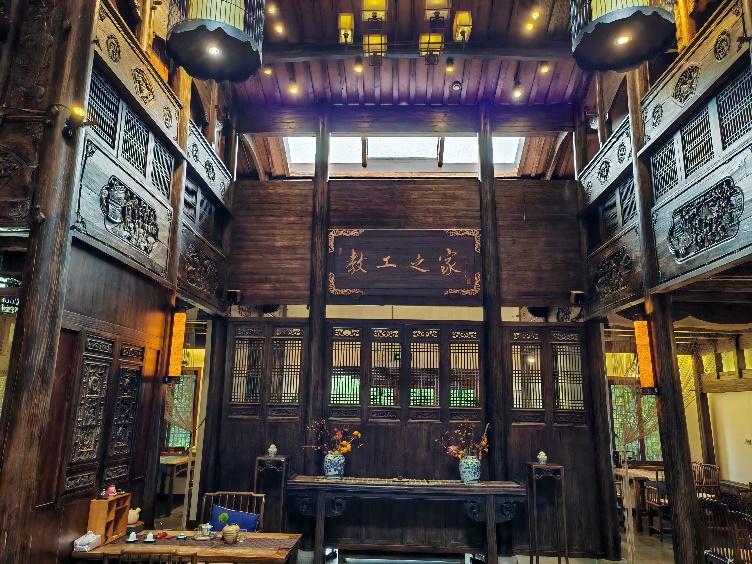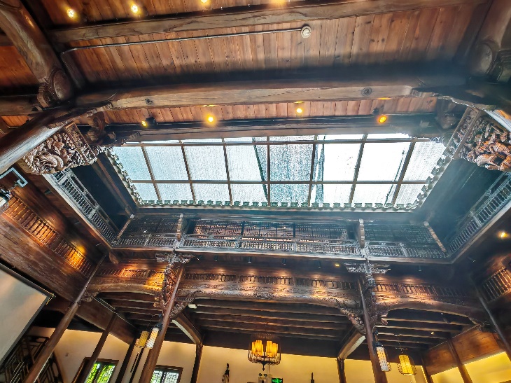 走進(jìn)“文修學(xué)院”,在狀元樓里,環(huán)顧四周,細(xì)細(xì)打量,五進(jìn)式的府邸,庭院深深、十分氣派,抬頭望去,雕梁畫柱中呈現(xiàn)出別具一格的四口天井,巧妙的設(shè)計(jì)將自然元素引入園內(nèi),笑納陽(yáng)光、空氣、雨水,坐擁天地自然。據(jù)稱:當(dāng)你坐在天井之下,陽(yáng)光透過天井開口,在不同時(shí)間段,從不同角度投射進(jìn)來,會(huì)形成光影交錯(cuò)、斑駁婆娑的特殊光影,豐富了空間的層次感,也為這棟深宅大院增添了特殊的韻味和視覺藝術(shù)感。