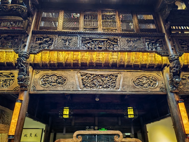 西樓古宅有一個(gè)面積25平方米的天井,四周的“格窗、牛腿、冬瓜梁”等雕刻非常精美,在徽州民宅古建筑中,如此尺度的天井和考究的雕刻,也實(shí)屬罕見。運(yùn)用“四水歸堂”“天井養(yǎng)氣”的中國(guó)傳統(tǒng)建筑理念,屋頂四面坡向內(nèi)傾斜,雨水從四面流入院內(nèi)天井,形成“肥水不流外人田”的格局,寓意了“四季財(cái)源滾滾,四面來運(yùn)聚聚”,古宅主人經(jīng)商有道,終究以德聚財(cái)、以和守業(yè),“天井藝術(shù)”造詣?lì)H深,也是此宅的匠心特點(diǎn)。