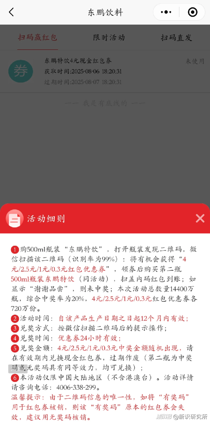 不過,東鵬的“一元樂享”活動看似操作簡單,實(shí)則背后設(shè)有多重高門檻,是東鵬在長期實(shí)踐中從“掃碼紅包”“箱碼紅包”等早期促銷形式逐步迭代升級而來。