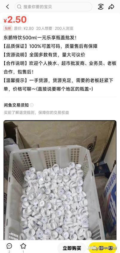 在一些電商和二手交易平臺上,出現(xiàn)了批量出售1元樂享中獎瓶蓋的帖子。有賣家標(biāo)注“東鵬特飲500ml,一元樂享瓶蓋批發(fā)”,標(biāo)價為2.5元。