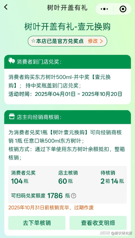 在對瓶蓋和箱體的二維碼進(jìn)行關(guān)聯(lián)采集后,2020年東鵬飲料“一元樂享”活動已能實(shí)現(xiàn)瓶蓋不回收,門店每核銷一瓶都會獲得核銷費(fèi)用的獎勵。