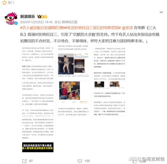 部分演員并不認可這種形式。2023年12月,張譯在《三大隊》路演時拒絕了觀眾讓他一同跳“科目三”舞蹈的邀請,表示更希望聽到觀眾朋友對電影的深度解讀,不想把時間放在跳舞上,相關(guān)話題還登上了多平臺熱搜。