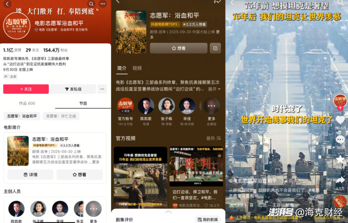 以電影的抖音官方賬號為例,2025年國慶檔熱度最高的是陳凱歌執(zhí)導(dǎo)的《志愿軍》系列?!吨驹杠姡涸⊙推健放c2023年國慶檔的《志愿軍:雄兵出擊》、2024年國慶檔的《志愿軍:存亡之戰(zhàn)》共用賬號,目前賬號粉絲量超過154萬。9月8日起,該賬號開始發(fā)布《志愿軍:浴血和平》相關(guān)內(nèi)容,目前單個視頻最高獲125.6萬贊。