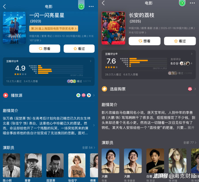 此前讓網(wǎng)友印象深刻的破圈營銷,如2023年12月的“張萬森,下雪了”讓豆瓣評分4.9分的《一閃一閃亮星星》拿到了超過7億元票房。該影片主演陣容與2022年的前作劇集一致,并無耳熟能詳?shù)闹輪T或明星,而2025年暑期檔陣容和制作都更為強大、豆瓣評分7.6分的《長安的荔枝》僅拿到6.7億元票房。為了宣發(fā),《長安的荔枝》在部分電影院做了下花瓣雨的效果,但這種模仿沒能復(fù)刻《一閃一閃亮星星》的成功。