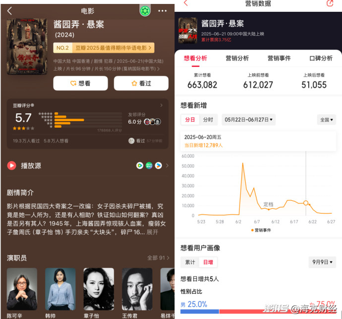 2025年暑期檔影片《醬園弄·懸案》亦屬此類。該影片2024年5月就由導(dǎo)演陳可辛攜主演章子怡等明星高調(diào)亮相戛納電影節(jié)。影片集結(jié)了章子怡、楊冪、趙麗穎等眾多明星,就連配角都多由知名演員出演。電影還號稱依據(jù)民國真實的詹周氏殺夫案改編,噱頭十足。但上映第一天就有不少用戶在社交媒體痛批該片為“大型預(yù)告片”,劇情“稀碎”。