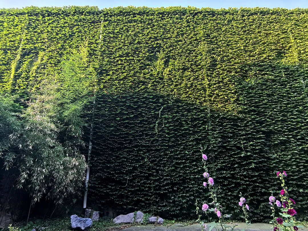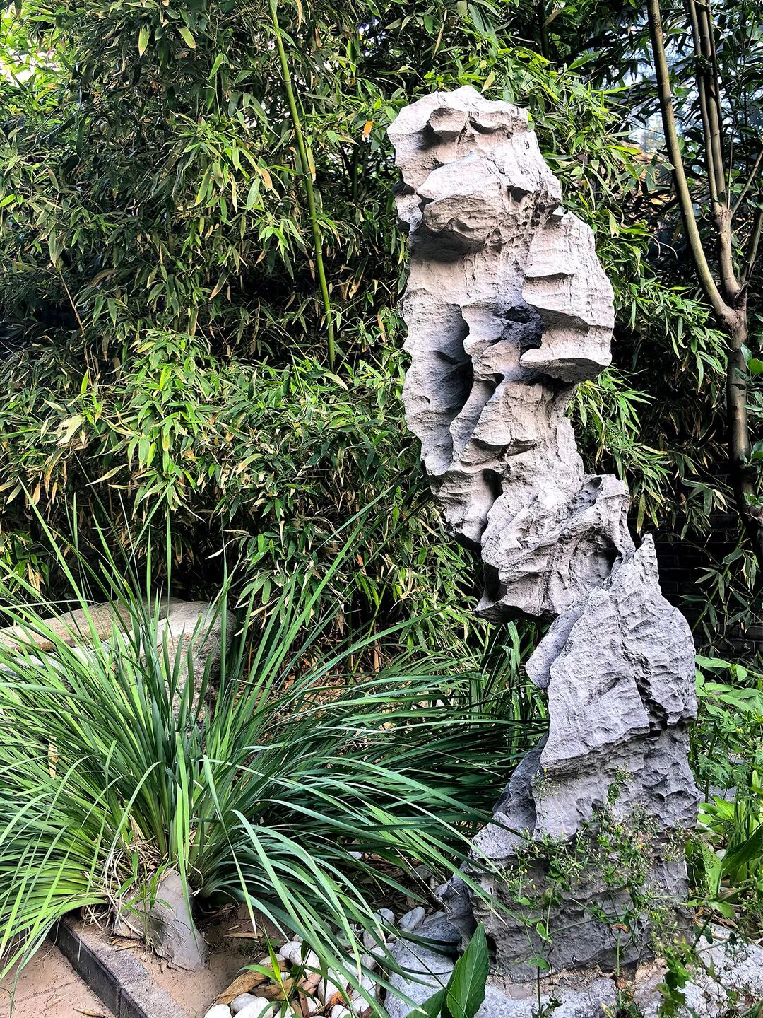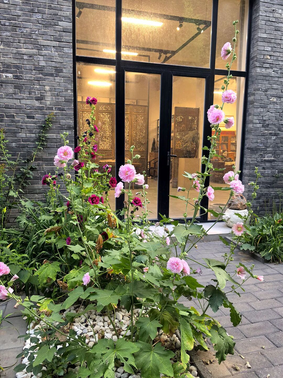 信步小院,賞石散落園圃:靈璧石臥于竹叢旁,青碧葉色襯得石身愈顯蒼古,石上苔痕似藏著光陰的絮語;太湖石倚著墻角,孔洞里似還兜著昨夜的風。門口蜀葵最是熱鬧,一朵朵攢著勁兒爭艷開放,粉紫、嫩紅的花瓣擠擠挨挨,花莖挺著直勁兒,像一群踮腳張望的孩童;爬山虎早把整面墻暈成濃綠的綢,葉尖垂著的露珠,風過就簌簌滾落。雨落時,石面凝的露似碎銀,葉隙漏下的雨珠敲出細碎聲響,這天地間天然的 “山水小品”,正是他寫生簿上最生動的底稿。