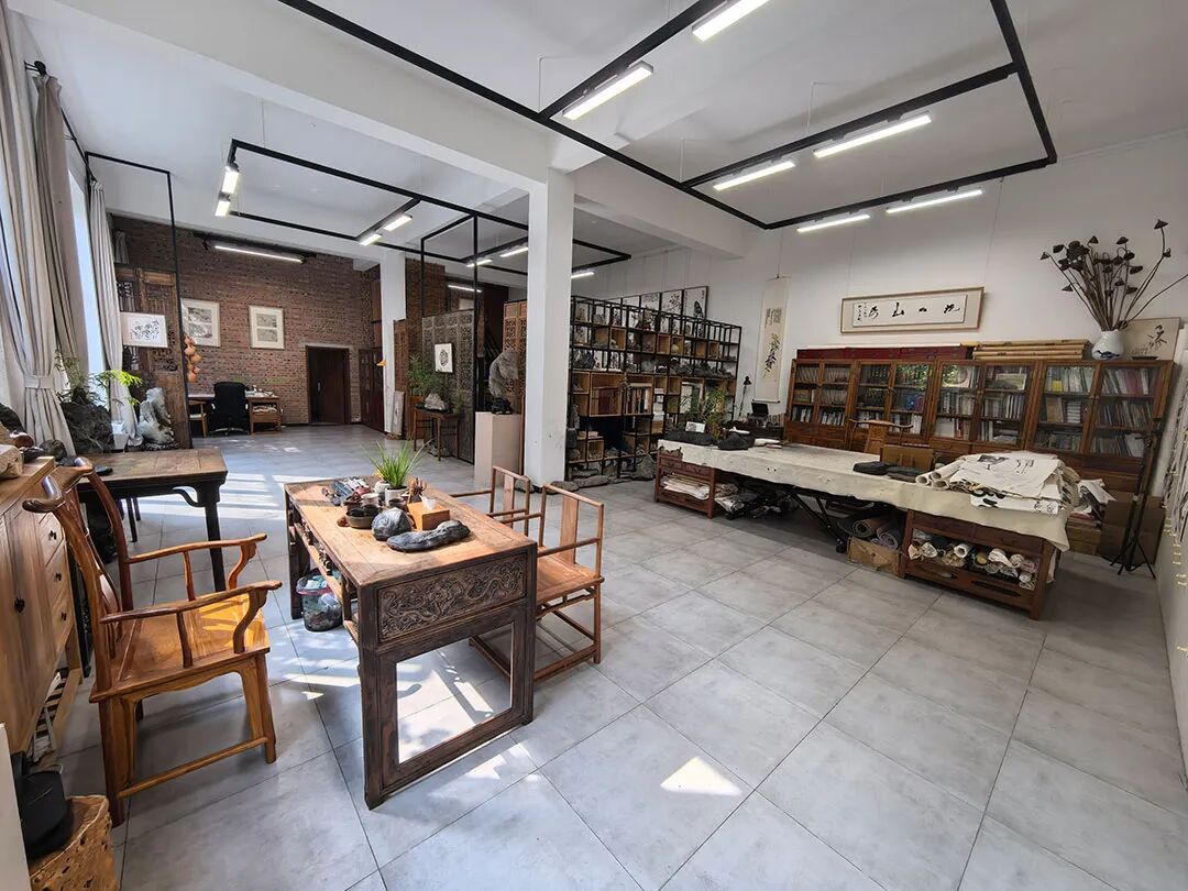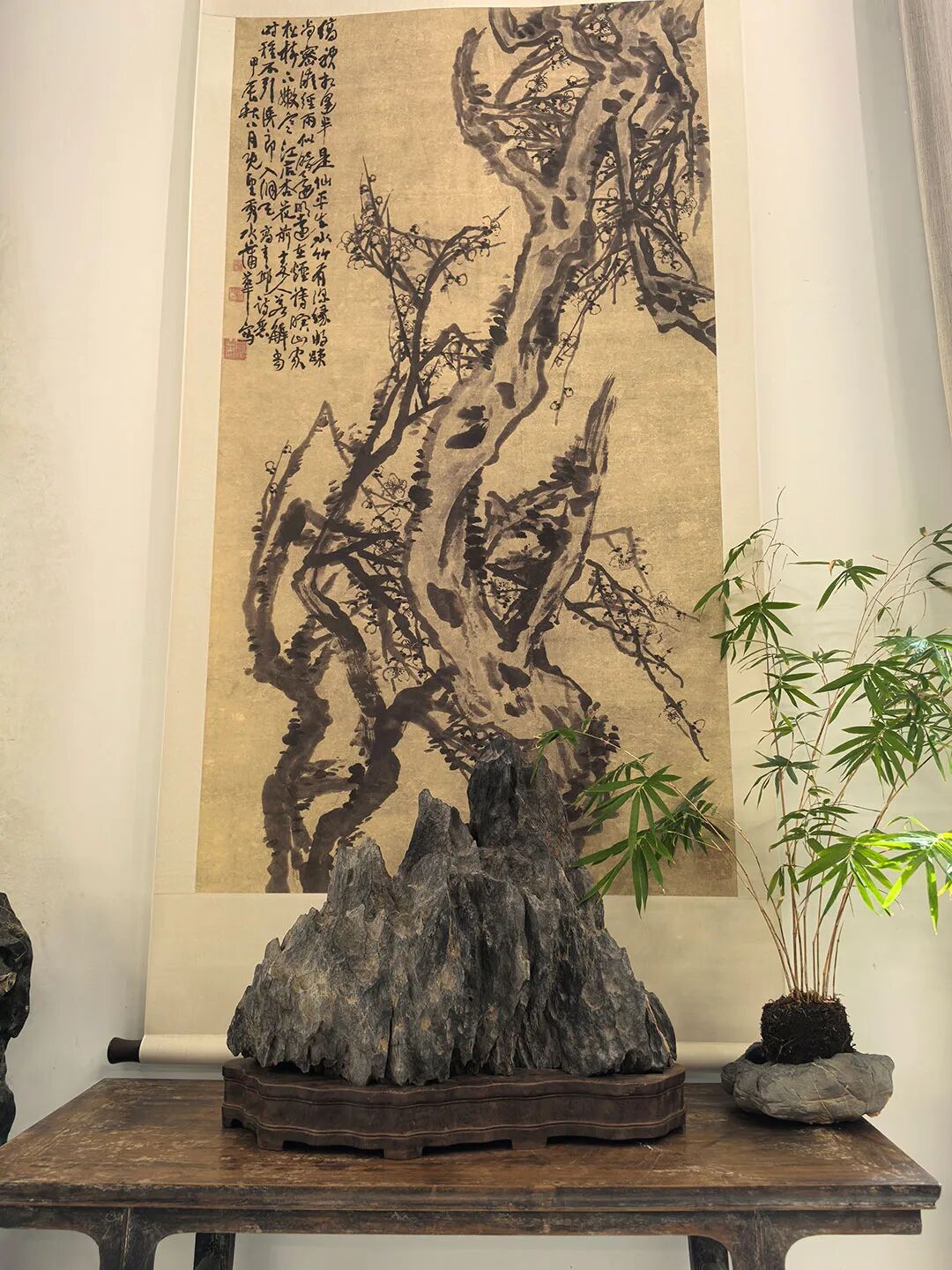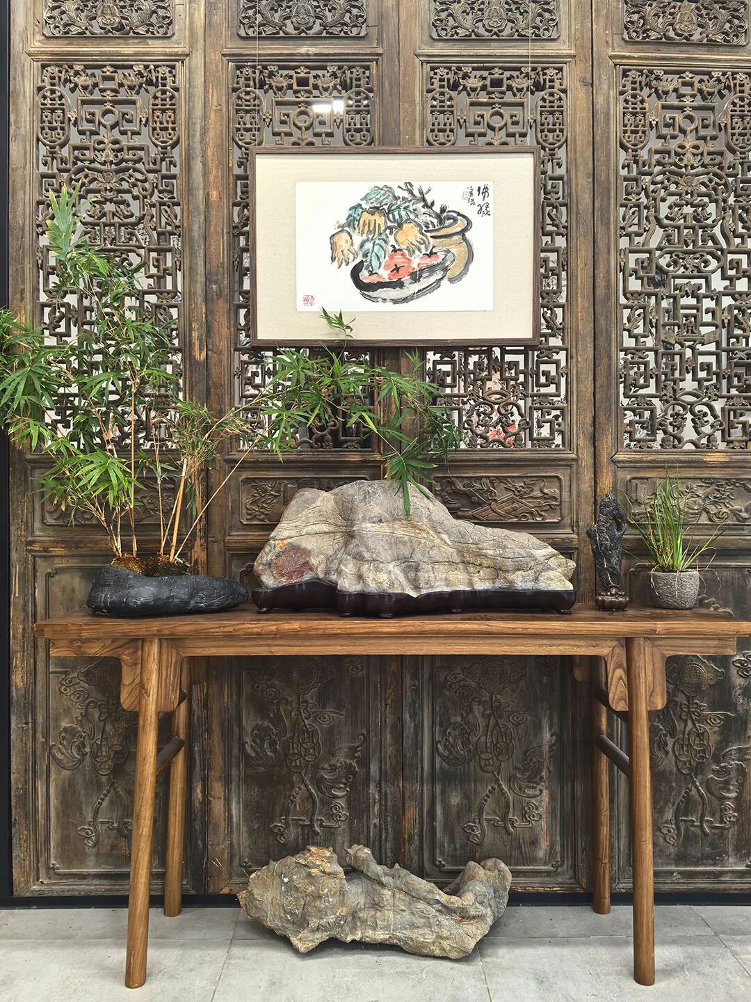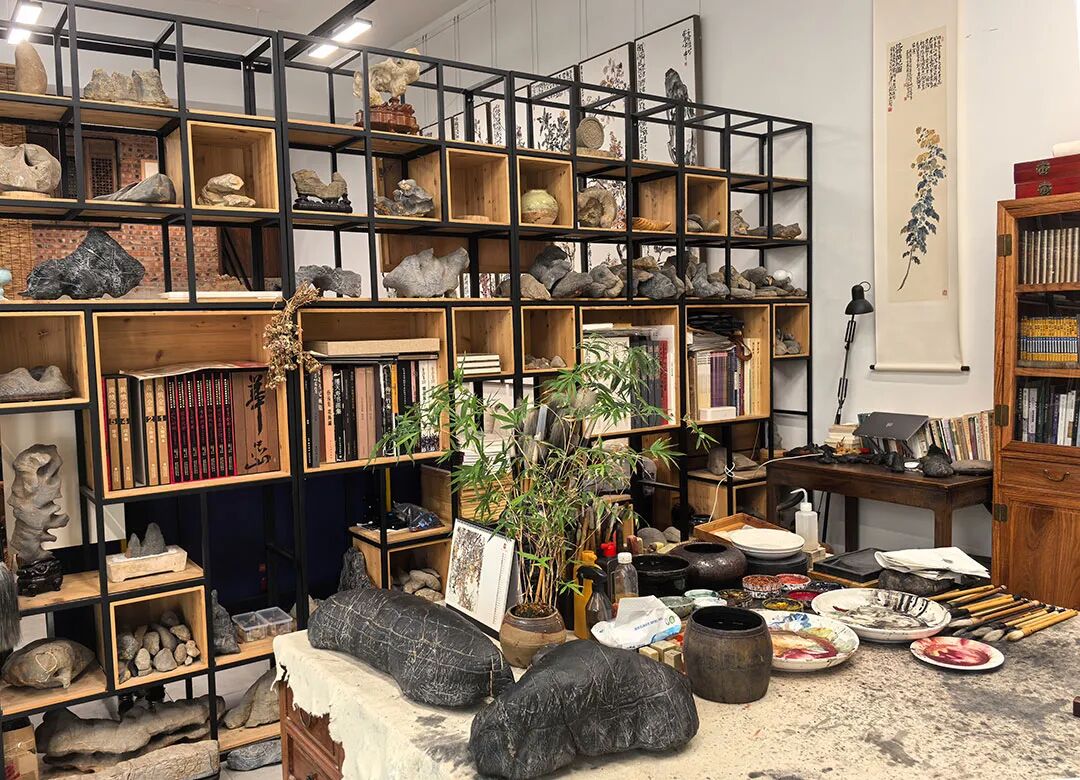 “洗石山房” 隱于宋莊深處,是陳昭以石為骨、織就文心的一方小天地,更藏著他寫意花鳥 “既傳統(tǒng)又當下” 的藝術密碼。室內(nèi)案頭,靈璧石或蜷如臥獸,或聳如危峰,“皺漏透瘦” 間既映著千年賞石的幽趣,也暗合金石筆墨的蒼莽骨力;現(xiàn)代鐵藝博古架上,各具形態(tài)的賞石錯落而立,一旁畫案,筆墨紙硯凌亂卻有序地鋪展,陶瓶里新竹抽著嫩梢,恰好點綴出一抹生機 —— 這生機,正源于他以 “寫生” 為舟楫,在版納雨林、日常園圃間踐行五代荊浩 “搜妙創(chuàng)真” 的古訓,與活物對談后,于筆墨間迸發(fā)的鮮活真意。