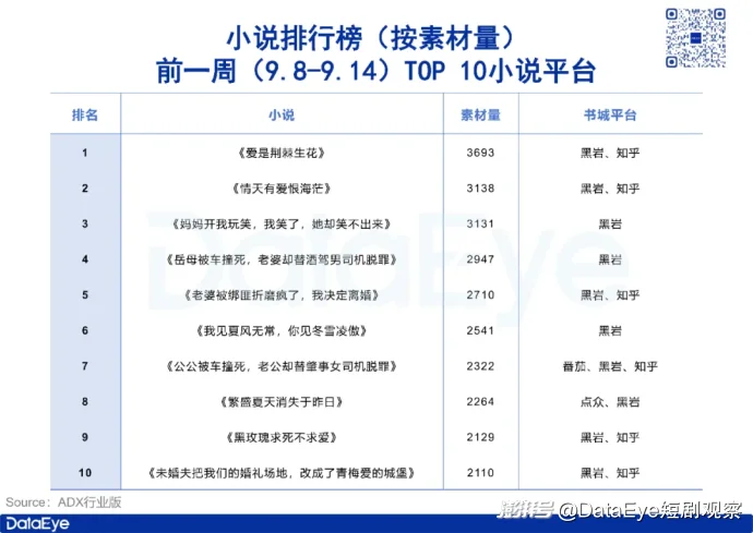 在平臺(tái)分布上,ADX行業(yè)版數(shù)據(jù)顯示,前一周(9.8-9.14)小說排行榜(按素材量排序)TOP 10小說書城方包含黑巖、知乎、番茄和點(diǎn)眾。其中,10部小說平臺(tái)均包含黑巖,黑巖占比100%,其次是知乎占比60%。