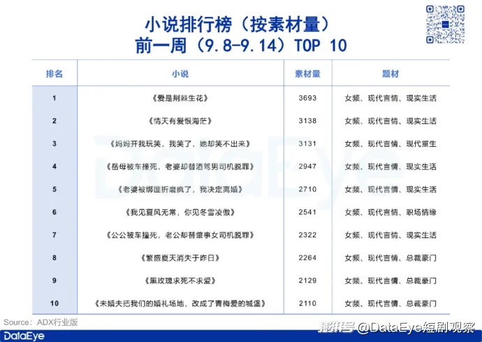 ADX行業(yè)版數(shù)據(jù)顯示,前一周(9.8-9.14)小說排行榜(按素材量排序)前十名均為女頻言情小說,占比100%,類型涵蓋現(xiàn)實(shí)生活、現(xiàn)代重生、職場情緣和總裁豪門。
