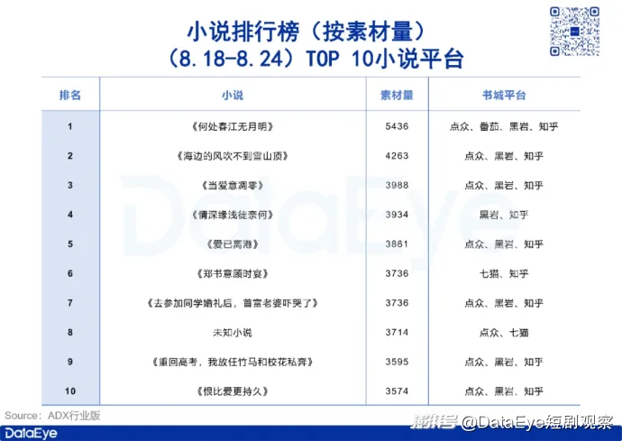 而在四周前(8.18-8.24),小說排行榜(按素材量排序)TOP 10小說書城方,知乎占比90%位列第一,點(diǎn)眾與黑巖占比則均為80%,此外書城平臺(tái)還涉及番茄與七貓。