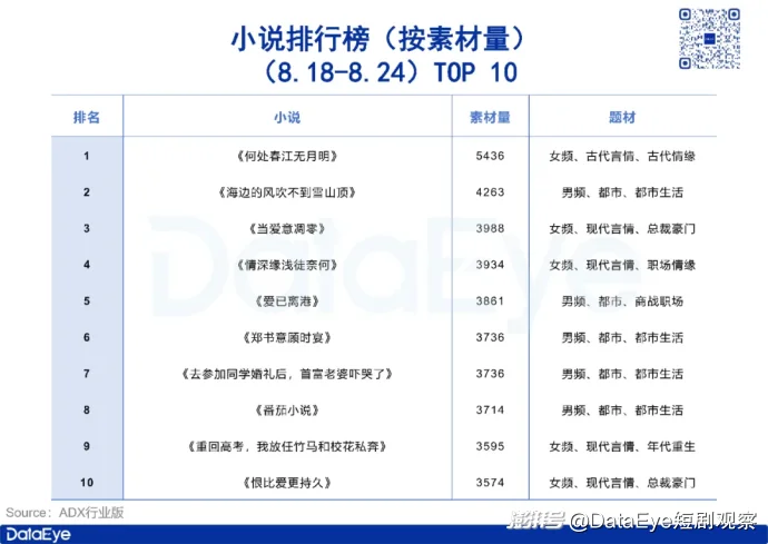 ADX行業(yè)版數(shù)據(jù)顯示,四周前(8.18-8.24)ADX小說排行榜(按素材數(shù)排序)TOP 10中,男頻、女頻小說各5部。其中榜首《何處春江無月明》為女頻古言題材,素材量5436組,第二名《海邊的風(fēng)吹不到雪山頂》為男頻都市題材,素材量4263組,第三名《當(dāng)愛意凋零》為女頻現(xiàn)言題材,素材量3988組。