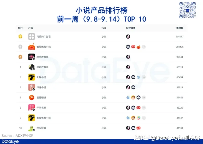 ADX行業(yè)版數(shù)據(jù)顯示,前一周(9.8-9.14)小說產(chǎn)品排行榜TOP 10中,除番茄小說、七貓小說等APP外,另有共5款小程序產(chǎn)品,其中有3款均為黑巖系產(chǎn)品。