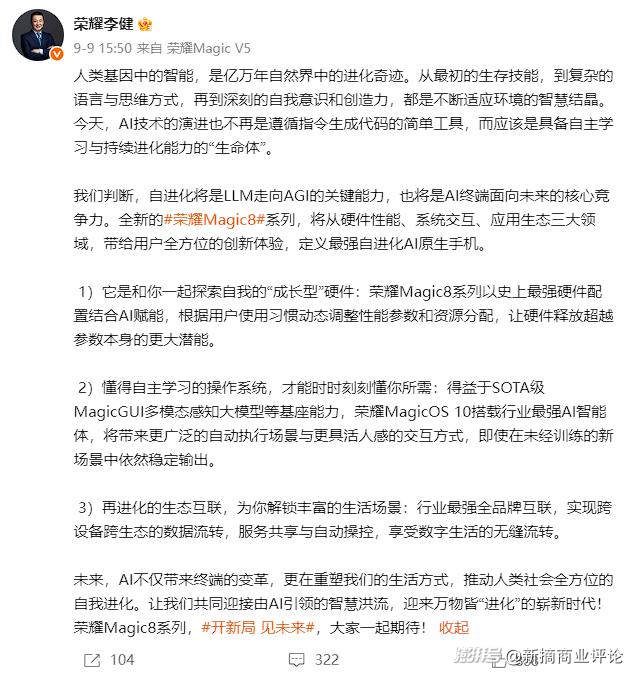 從榮耀CEO李健的微博“劇透”來看,榮耀Magic8最有可能是其自進(jìn)化理念的集大成之作。