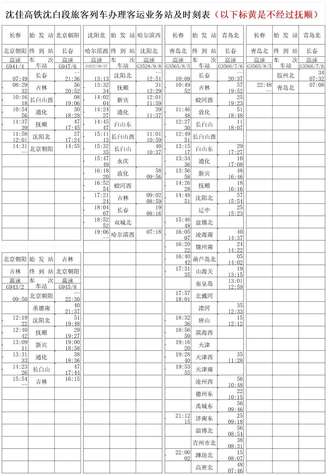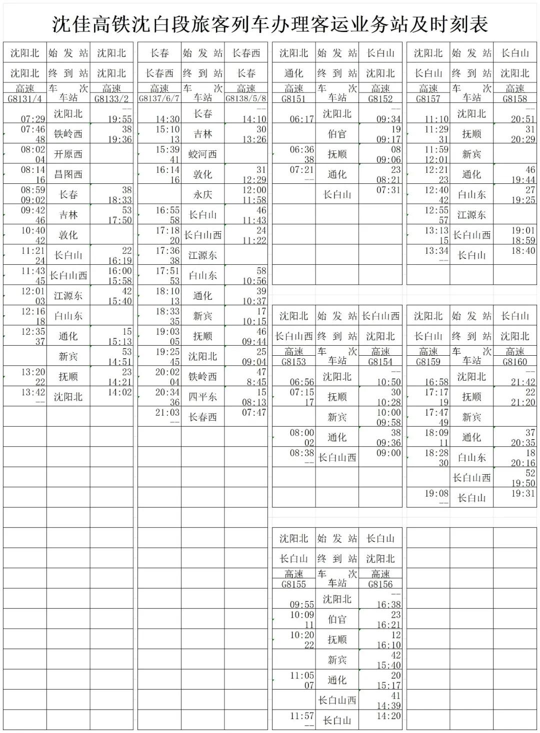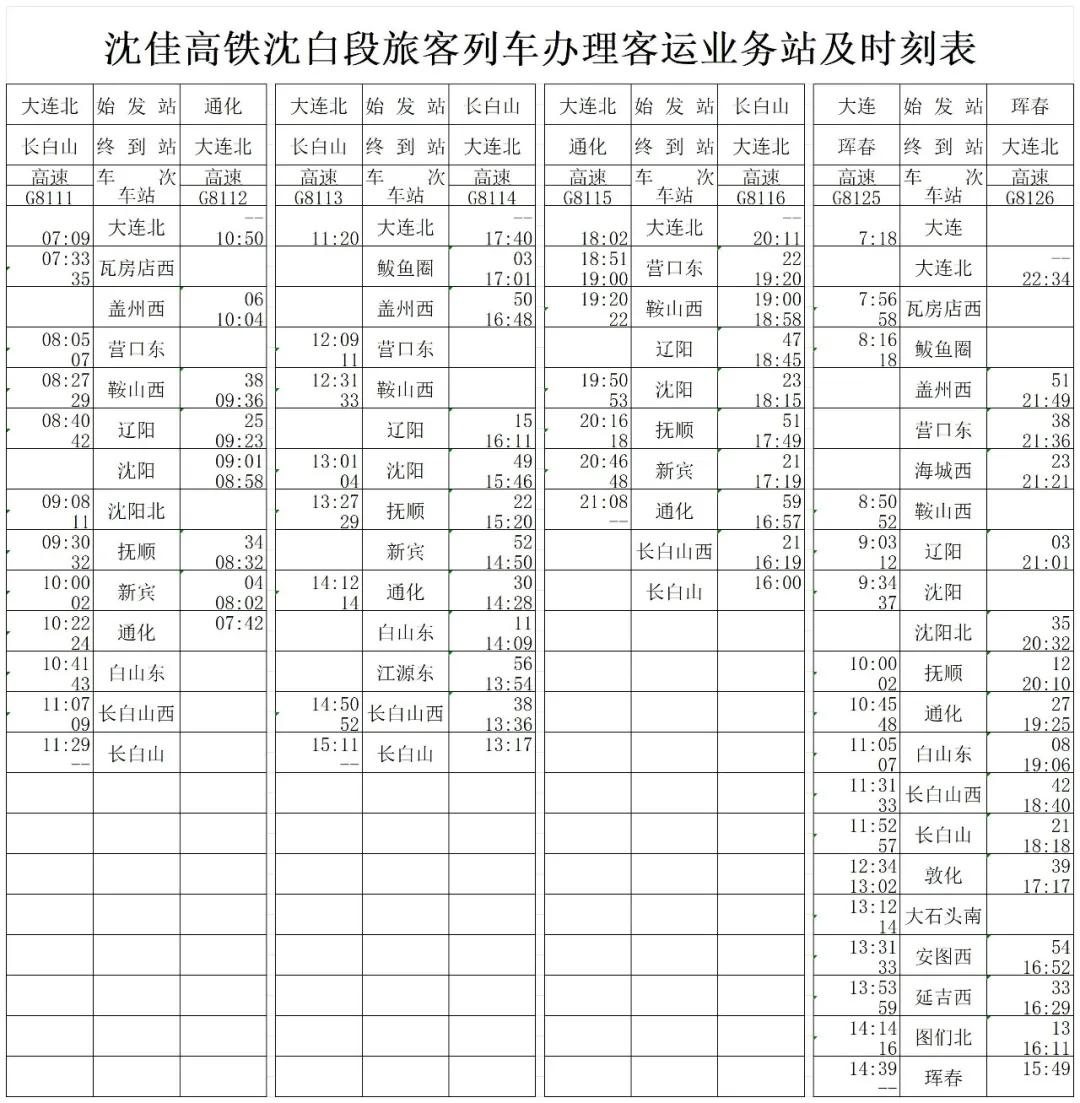 另外,有4趟列車構(gòu)成了獨(dú)特的“環(huán)線高鐵”,它們分別是沈陽北開往沈陽北、長春開往長春西,途經(jīng)撫順、新賓、通化、長白山、吉林、長春、鐵嶺西。此外,還有8趟高鐵列車從大連北出發(fā),前往長白山、通化和琿春。同時,沈陽北至哈爾濱、長春至青島北的高鐵列車,途經(jīng)錦州南、秦皇島、天津、濟(jì)南東。另有2趟動車組列車從丹東駛向延吉西,途經(jīng)撫順和通化。