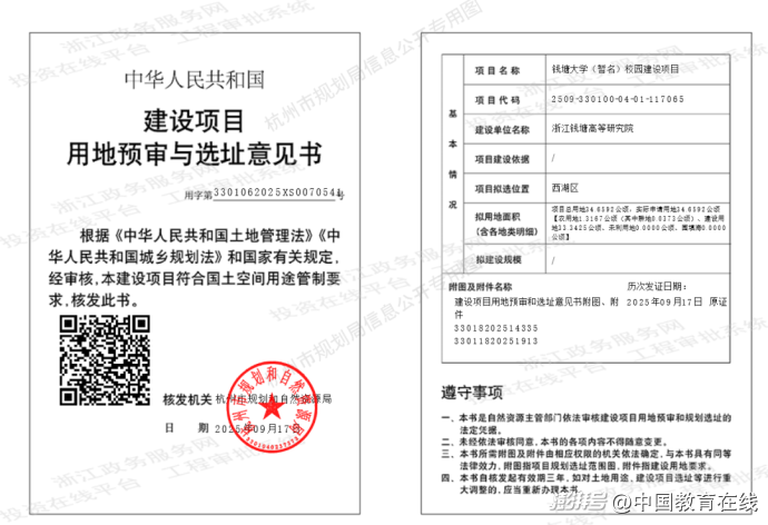 同年6月,杭州市行政審批服務(wù)管理辦公室網(wǎng)站刊發(fā)一則由杭州市規(guī)劃和自然資源局供稿的文章《錢塘大學(xué)獲批!為高等教育發(fā)展注入強(qiáng)勁動(dòng)力》顯示,錢塘大學(xué)用地已于5月17日獲得省政府批準(zhǔn),為錢塘大學(xué)落地建設(shè)筑牢了土地要素根基。