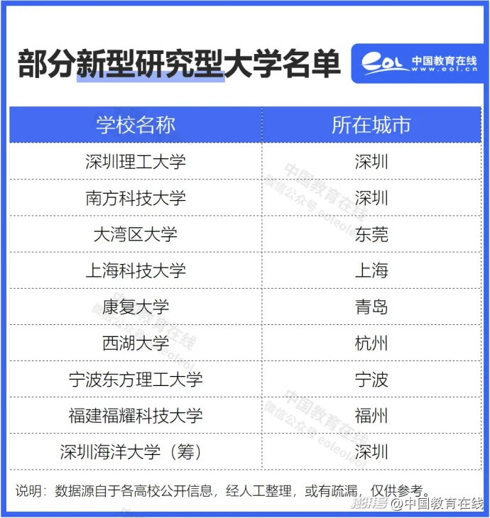 我國(guó)的新型研究型大學(xué)之路,始于2012年。這一年,教育部批準(zhǔn)成立南方科技大學(xué),開啟了新型研究型大學(xué)建設(shè)之路。之后,于2013年批準(zhǔn)成立的上??萍即髮W(xué)、2018 年設(shè)立的西湖大學(xué),均為新型研究型大學(xué)。2024年5月,教育部批準(zhǔn)設(shè)立了深圳理工大學(xué)(理工類)和康復(fù)大學(xué)(醫(yī)藥類),同樣定位為高水平新型研究型大學(xué)。今年,教育部同意設(shè)置福建福耀科技大學(xué)、大灣區(qū)大學(xué)、寧波東方理工大學(xué)3所新型研究型大學(xué)。此外,正在建設(shè)中的深圳海洋大學(xué)(籌)定位也是新型研究型大學(xué)。