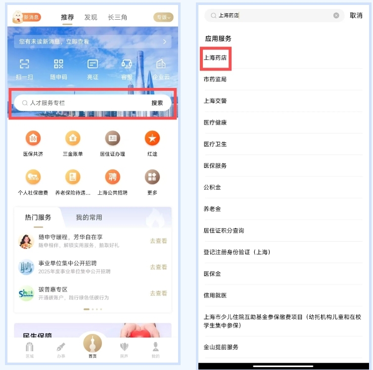 打開(kāi)“隨申辦市民云”APP,首頁(yè)搜索關(guān)鍵詞“上海藥店”,點(diǎn)擊進(jìn)入對(duì)應(yīng)服務(wù)。