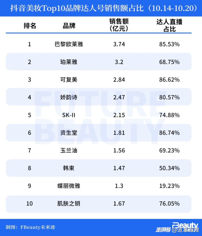 頭部品牌也一樣。去年雙11期間,巴黎歐萊雅一周內(nèi)賣(mài)出去了3.74億元GMV,其中達(dá)播占比高達(dá)85%以上,可復(fù)美、嬌韻詩(shī)、資生堂的達(dá)播占比都高于八成;珀萊雅、SK-II、肌膚之鑰、OLAY等品牌達(dá)播占比也均在70%。