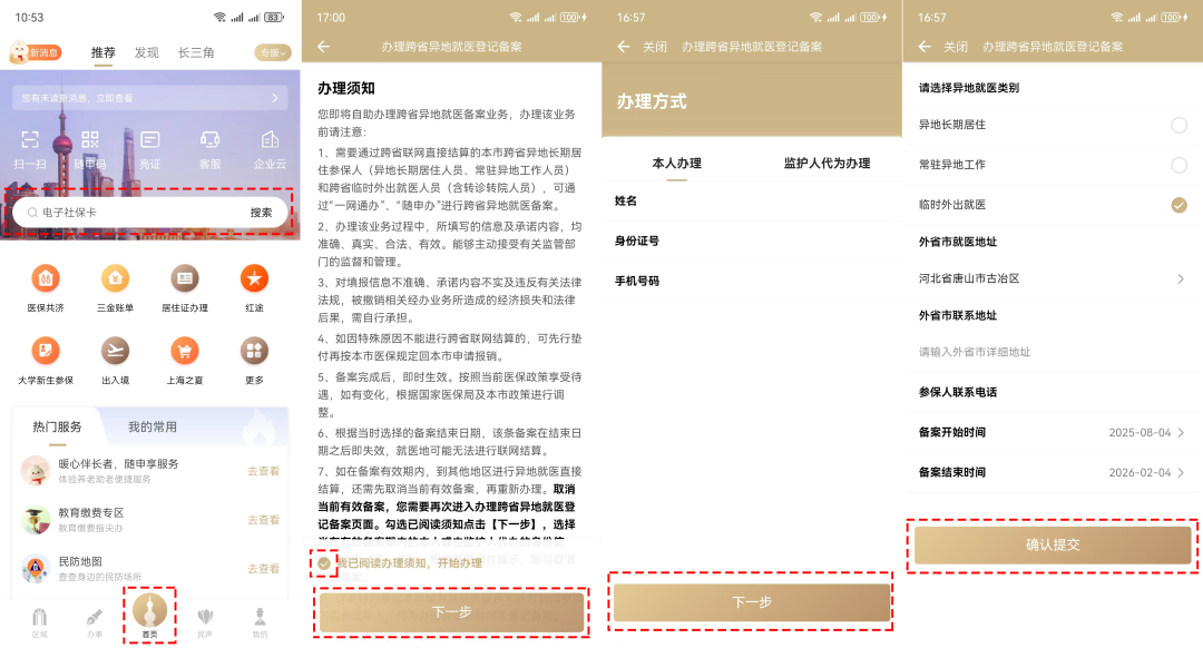 登錄“隨申辦市民云”APP→首頁搜索框輸入關(guān)鍵字“異地就醫(yī)”→點擊“辦理跨省異地就醫(yī)登記備案”→閱讀辦理須知→確認(rèn)辦理方式→填寫信息(包括異地就醫(yī)類別、外省市聯(lián)系方式、備案開始和結(jié)束時間等),點擊“確認(rèn)提交”即可。