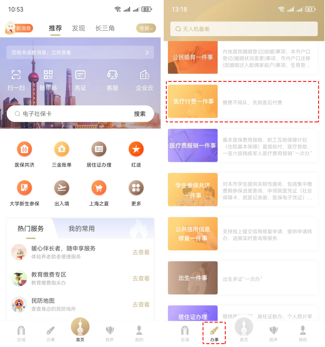 實名登錄“隨申辦市民云”APP→點擊“辦事”頻道→點擊“醫(yī)療付費(fèi)一件事”進(jìn)入服務(wù)頁;