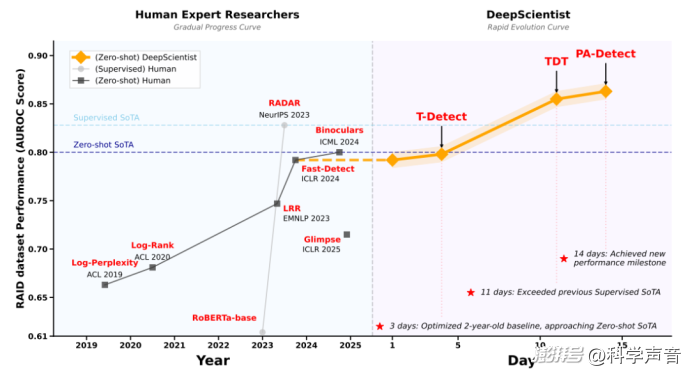 在短短兩周內(nèi),DeepScientist 自主地設(shè)計(jì)、編程、并迭代了三個(gè)越來(lái)越強(qiáng)的方法(T-Detect, TDT, 和 PA-Detect)。最終結(jié)果是:它不僅將識(shí)別準(zhǔn)確率的最先進(jìn)水平提升了 7.9%,還順便把檢測(cè)速度提高了一倍 。人類研究者三年的漸進(jìn)式積累,被它以一個(gè)全新范式在短短兩周內(nèi)一舉超越——這不僅是效率的勝利,更是方法論的躍遷。