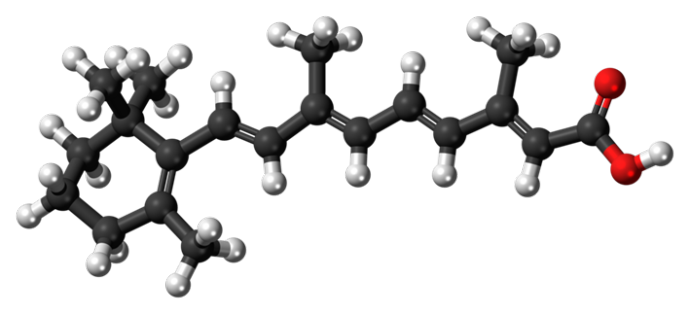 視黃酸分子的球棍模型。黑色:碳;白色:氫;紅色:氧。(圖源:Jynto|Wikimedia Commons)