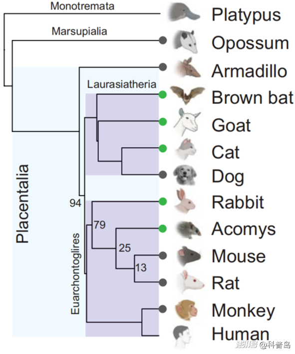 部分胎盤哺乳動物演化樹,其中,標示綠色的物種擁有組織再生能力 (圖源:北京生命科學(xué)研究所)