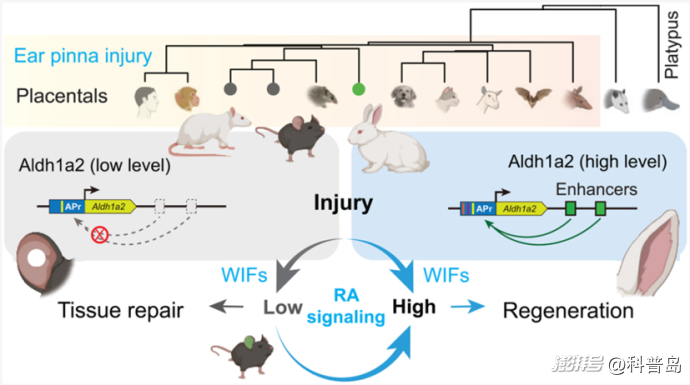 研究發(fā)現(xiàn),在兔子耳朵受傷后,其體內(nèi)的視黃酸合成通路會被迅速激活,產(chǎn)生大量視黃酸來指導(dǎo)細胞進行有序再生。