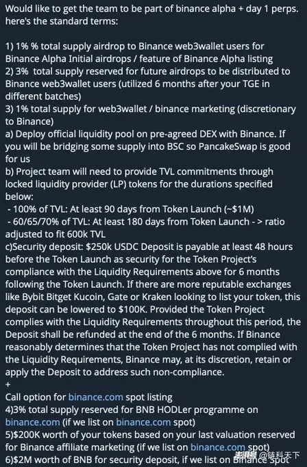 事件的起點是Limitless創(chuàng)辦人CJ在社媒上發(fā)布的一則帖子。他詳細列出了一份據(jù)稱來自幣安的上幣合作條款,其內(nèi)容令業(yè)界嘩然。根據(jù)CJ曝光的文件,若一個項目希望在幣安上線現(xiàn)貨交易,并參與Alpha和永續(xù)合約,其付出的代價極其高昂: