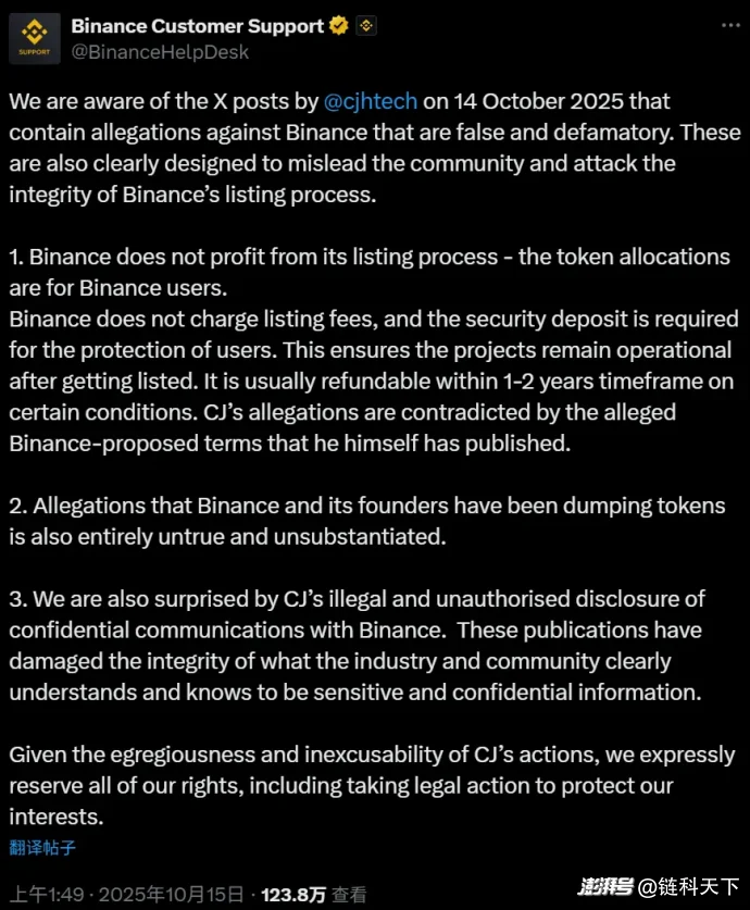 面對如此具體的指控,幣安迅速做出反應(yīng)。其官方客服渠道發(fā)布聲明,稱CJ的指控是“虛假且具誹謗性的”,并保留采取法律行動的權(quán)利。幣安在聲明中重申了幾點核心立場: